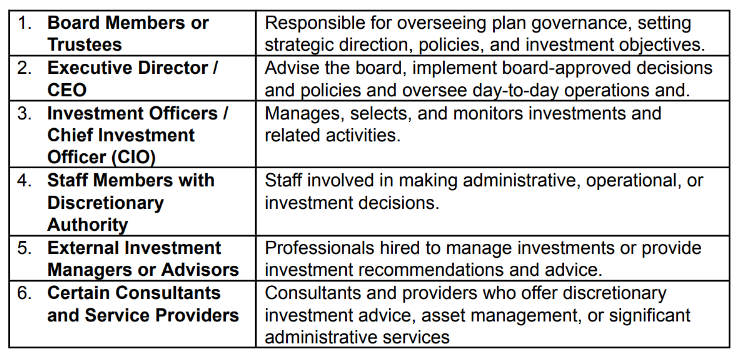 In a public retirement system, a fiduciary is any person who exercises discretionary authority or control over the management of the retirement system or its assets, provides investment advice for compensation, or has discretionary responsibility in administering the plan. Fiduciaries typically include: