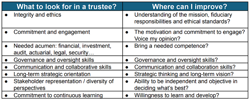 So, stakeholders ought to carefully consider the characteristics of effective trustees when they elect or appoint them. Likewise, becoming a public retirement fiduciary is a very significant responsibility. Are you ready? What can you do to prepare? What should stakeholders look for in a trustee? Trustees should ask themselves, “Where can I improve?”